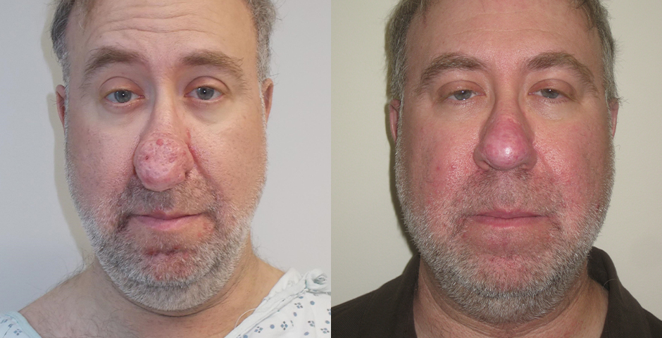 Rhinophyma is a dermatological skin condition that primarily affects the nose, causing it to grow larger and bulbous, or to appear red and bumpy, or a combination of both. The exact cause of rhinophyma is not entirely known, though research indicates that it’s a condition that can occur when a severe case of rosacea called phymatous rosacea is left undiagnosed and untreated.